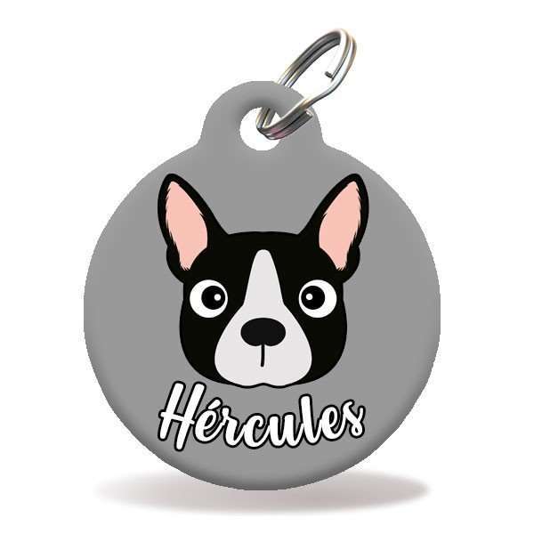Chapa para perro personalizada con la raza Boston Terrier a todo color de metal, ligera y resistente. Totalmente personalizable en ambas caras a todo color.