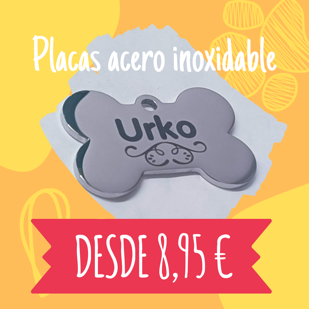 Chapa grabada para perro clasica en acero inoxidable y diseño de hueso y varios colores.