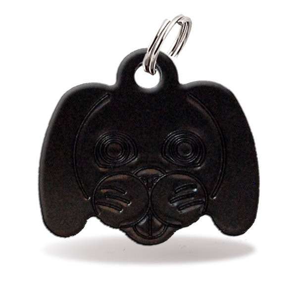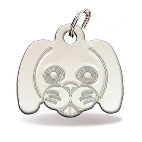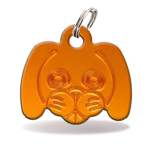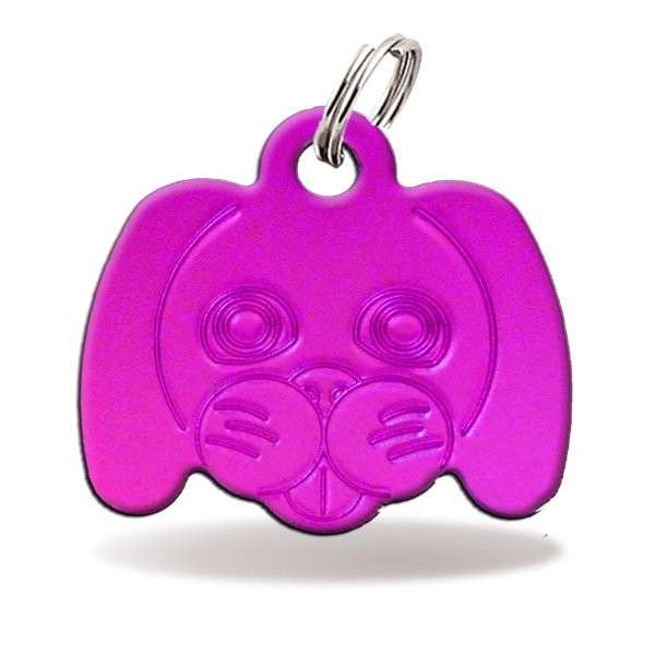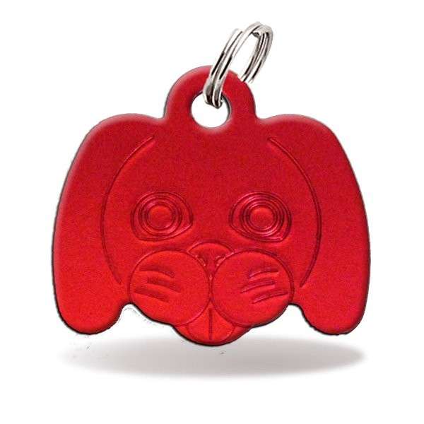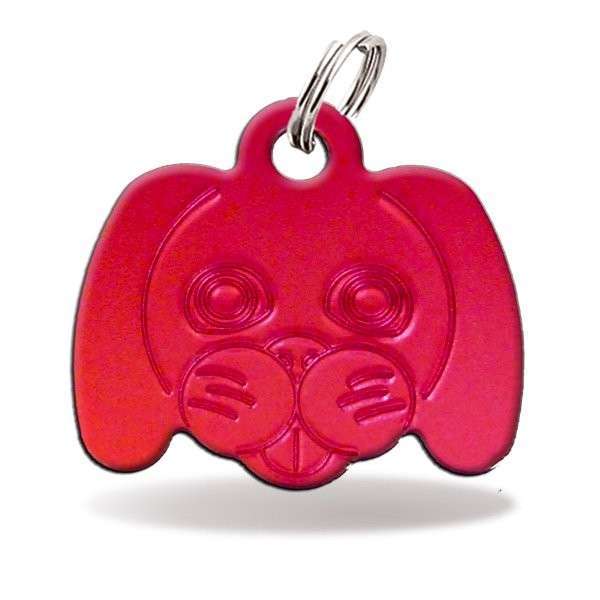 Placas para perros con nombre en aluminio anodizado y diseño de carita de perro. Estas placas son ideales para quien quiere una placa económica, ligera y funcional.